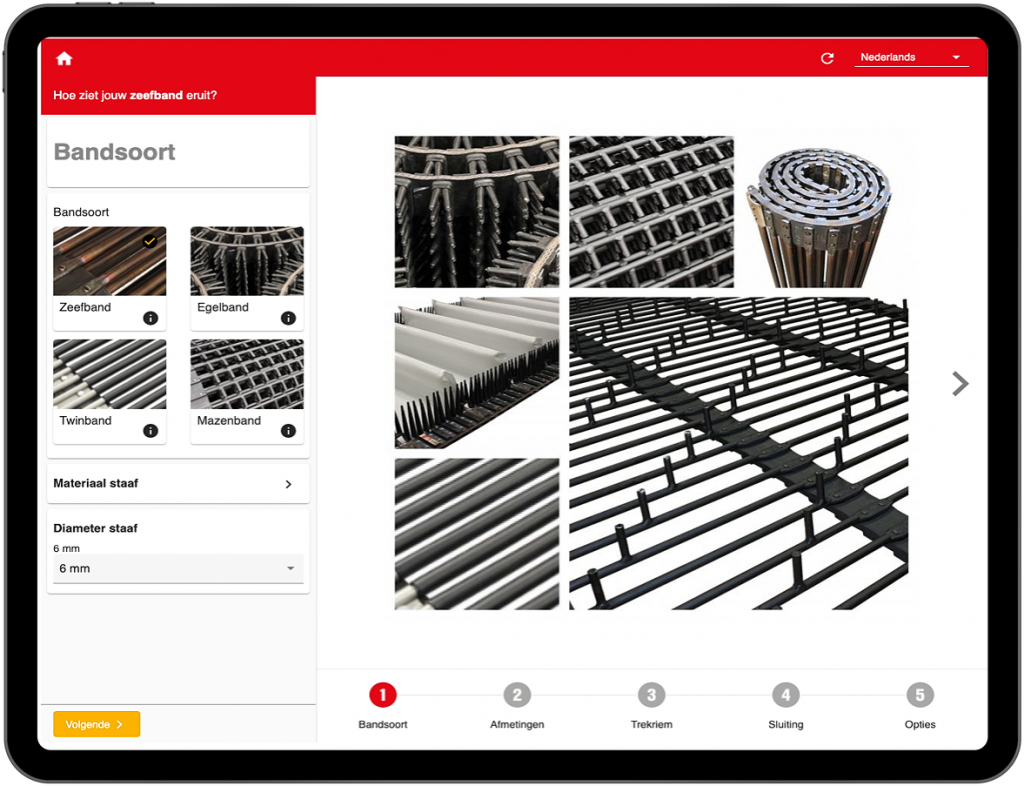Met onze online zeefbanden configurator stel je eenvoudig je maatwerk samen. Kies bandsoort, afmeting, trekriem, sluiting en aanvullende opties.