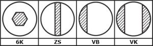 6-kant-gat (6K) voor een inbussleutel. Andere mogelijkheden zijn zaagsnede (ZS), vlakke baan (VB) op draadeind en vlakke kant (VK) op de borst.
